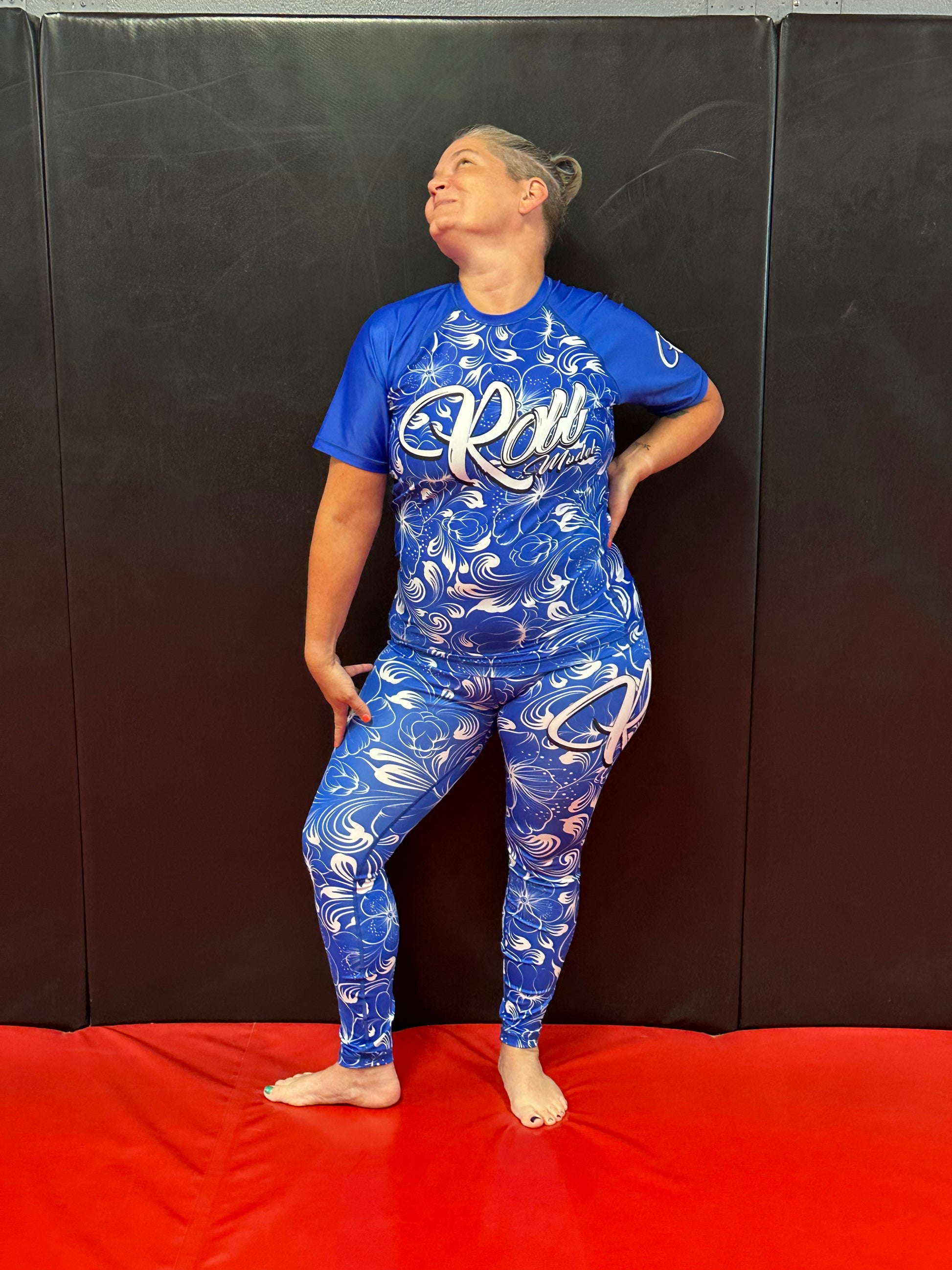 These are nice, squat-proof spats! They are sized like our ranked Roll Model spats with the thick waistband. These gorgeous spats are IBJJF approved and have a matching floral rashguard!