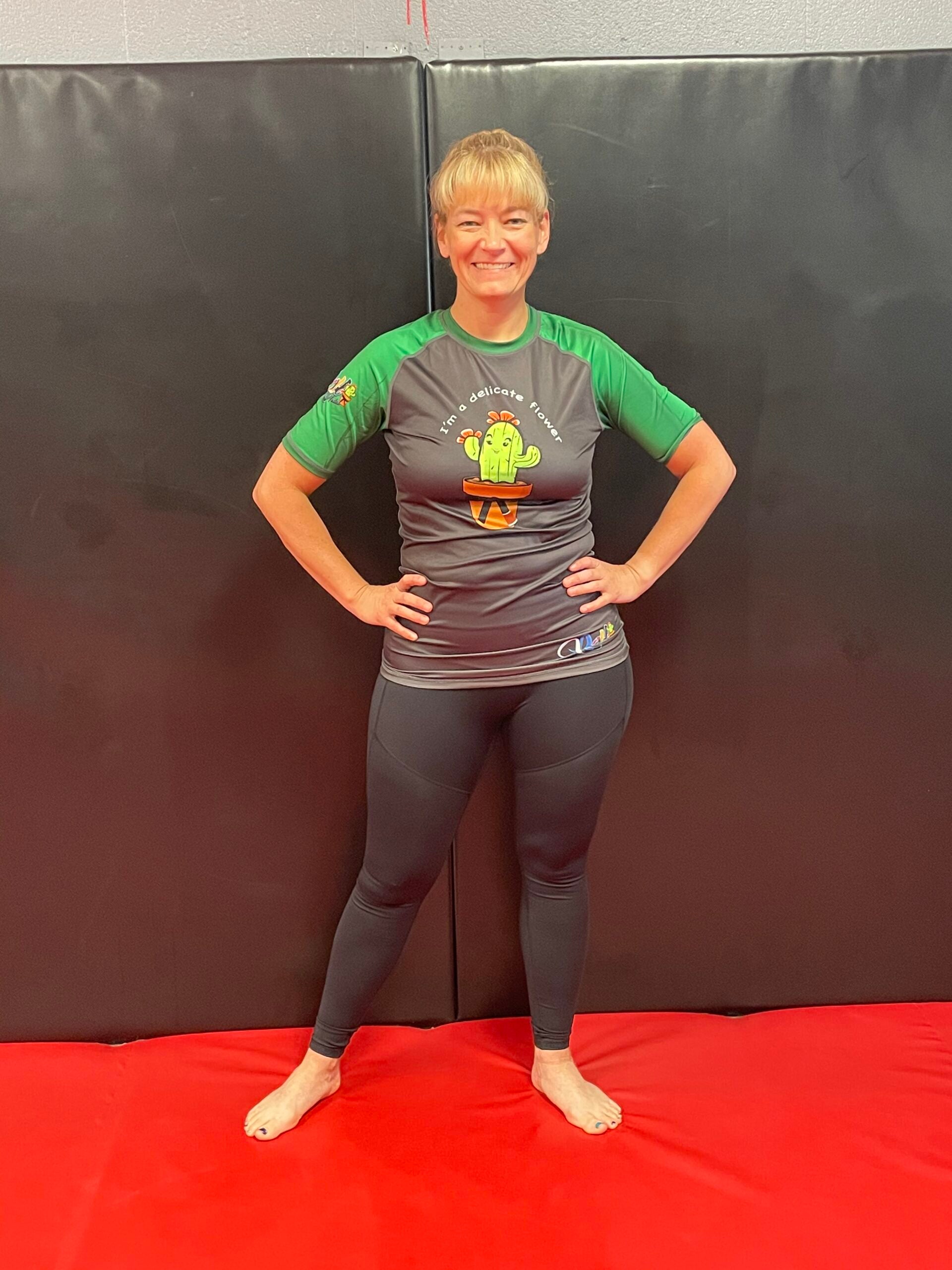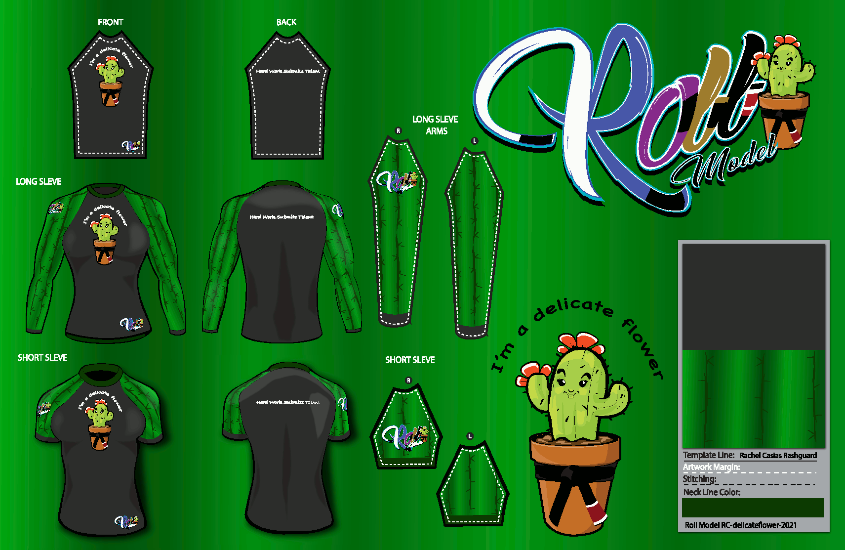 This rashguard was inspired by Roll Model's favorite Black Belt: Rachel Casias. She’s a delicate flower; that flower just happens to be ready to stab you, just like a cactus! Also, if you give it too much water it might get water logged! The front says "I'm a delicate flower" and the back says "Hard Work Submits Talent." Rachel leads from the front working hard and inspiring (making) us do the same!