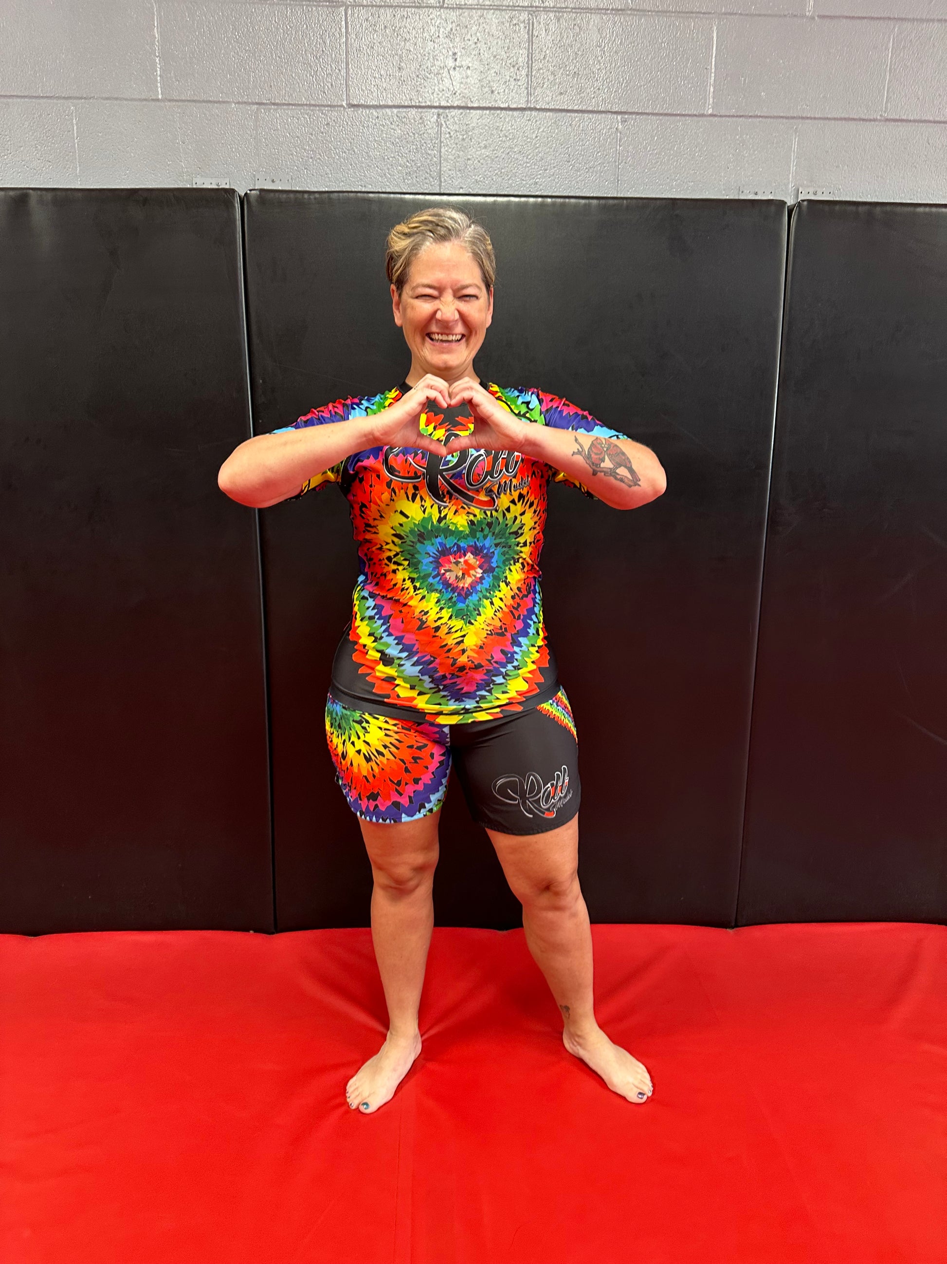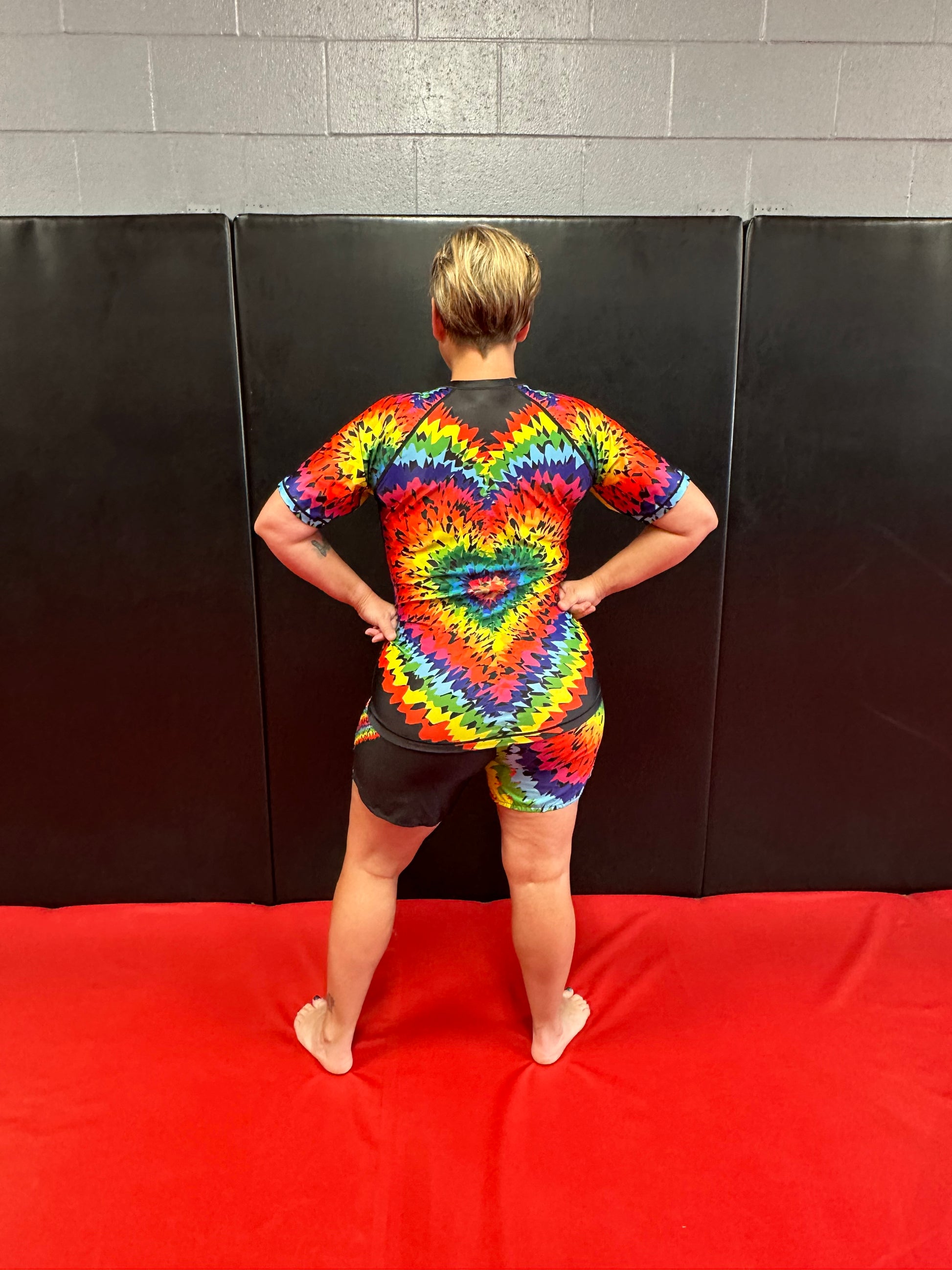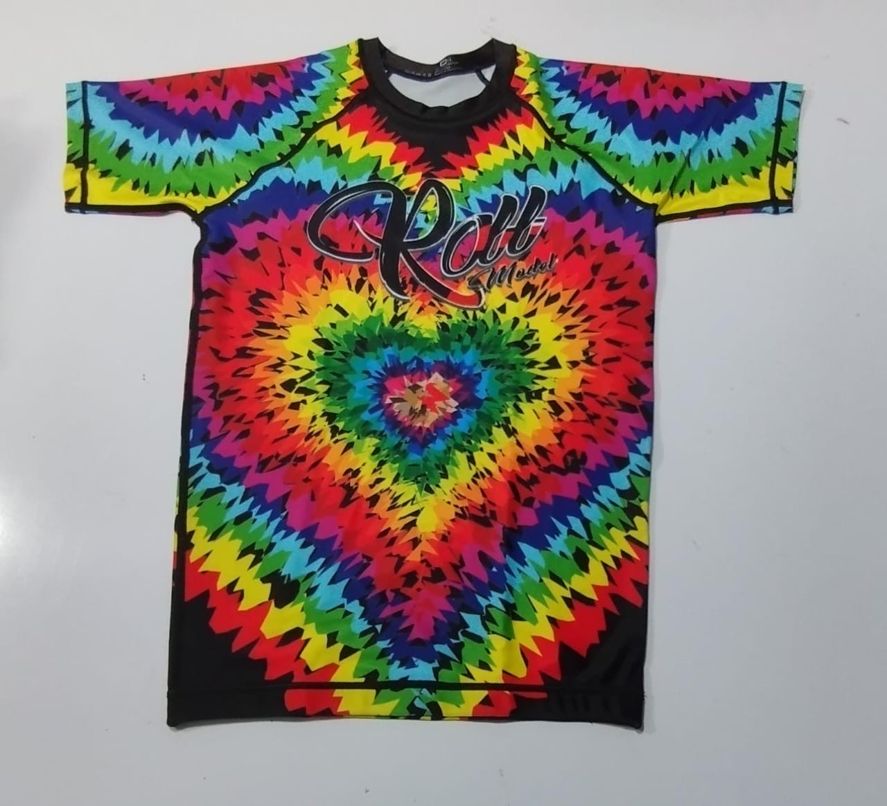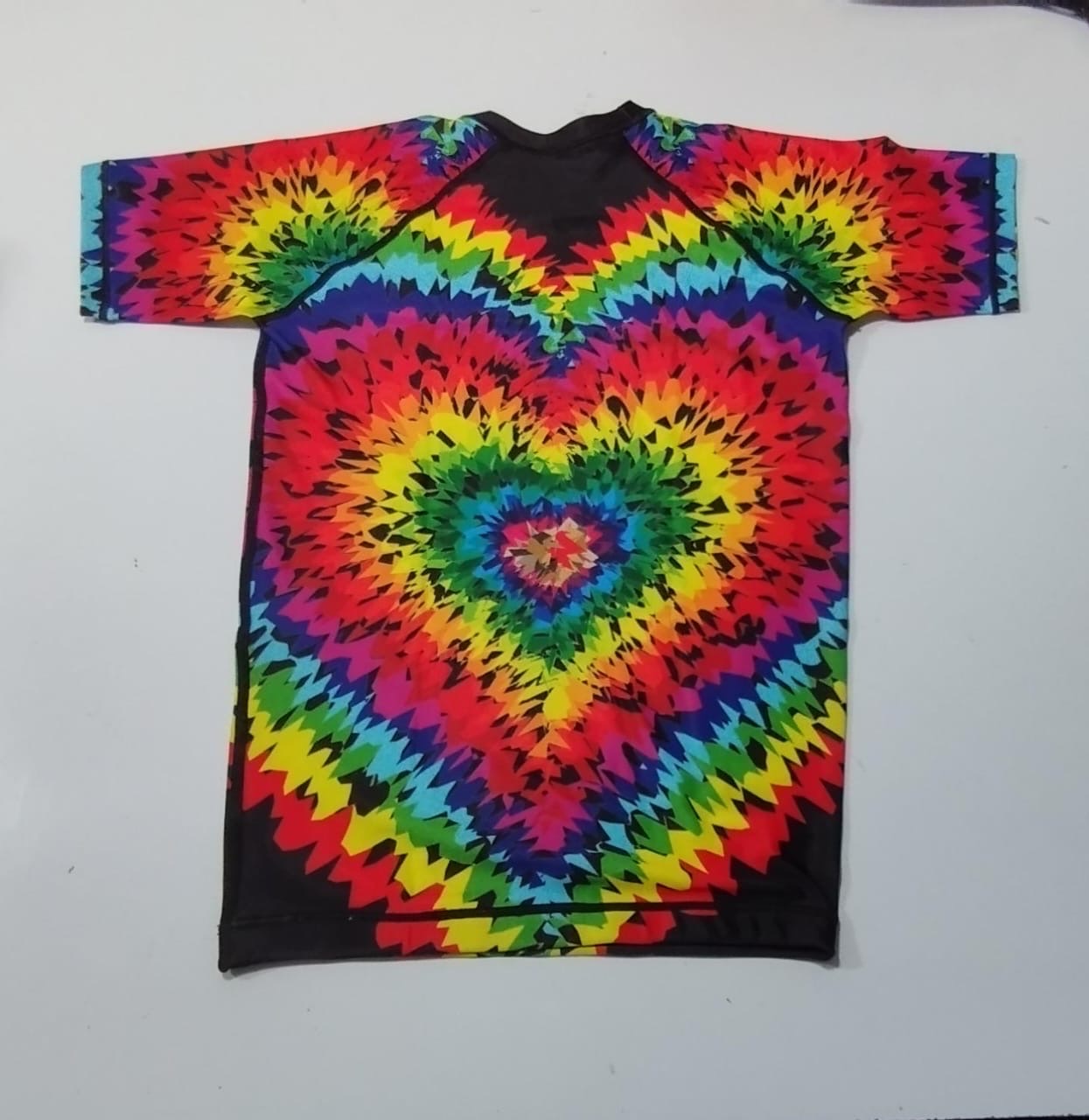 This rashguard features a tie dye in a heart shaped pattern.